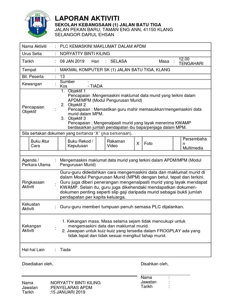 Laporan Aktiviti Plc Kemaskini Maklumat Murid Dalam Apdm Bil 1 2019 Pdf